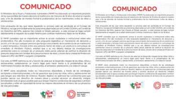 El Ministerio de la Mujer y Poblaciones Vulnerables comparte en sus redes sociales, el histórico proyecto de ley para poner fin a los matrimonios infantiles y salvaguardar la integridad de las niñas y adolescentes en nuestro país.“El MIMP ha elaborado un importante proyecto de ley que prohíbe de manera absoluta el matrimonio de menores de 18 años de edad en nuestro país, a fin de abordar de manera frontal la problemática de los matrimonios civiles de niñas y adolescentes”, se lee en su comunicado a través de Twitter.