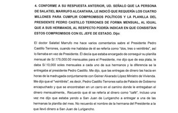 “El día 03 de marzo de 2022, a Marrufo le urgía que le cancele el cupo para la planilla del presidente de marzo. Me pidió, sin embargo, que ese mes le diera 500,000 soles. Me señaló que ese dinero el presidente se lo había pedido al que luego fue ministro, Félix Chero, para que el juez deje en libertad a sus sobrinos”, señaló.