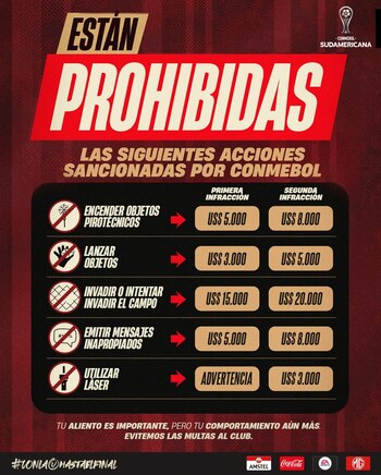 Con el fin de prevenir acciones de sus hinchas que perjudiquen a la institución, Universitario lanzó un comunicado indicando las prohibiciones de Conmebol y las multas que estas conllevan. Estas son las siguientes