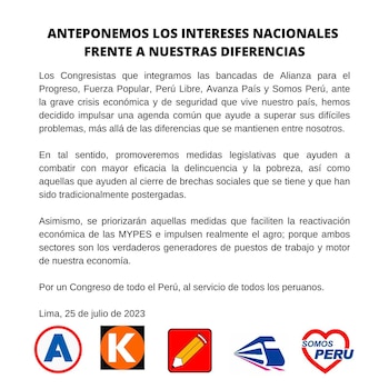 “Esto no constituye ninguna alianza política, esto no es un pacto político o ideológico, (la alianza) es un acuerdo político con la finalidad de gestionar, de administrar de la mejor manera un poder del Estado. Nadie cede sus posiciones, todos (los partidos) mantinen su autonomía política, sus aspiraciones, sus postulados”, indicó a la prensa.