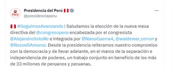 “Estoy seguro de que llegaremos a consensos priorizando el bienestar de los 33 millones de peruanos y peruanas. Con su compromiso podremos acordar normas en beneficio del país y quienes más nos necesitan”, tuiteó.