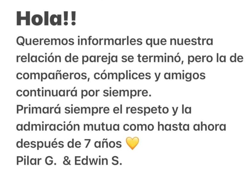 “Hola, queremos informarles que nuestra relación de pareja se terminó, pero la de compañeros, cómplices y amigos continuará por siempre. Primará siempre el respeto y la admiración mutua, como hasta ahora”, se lee en su comunicado.