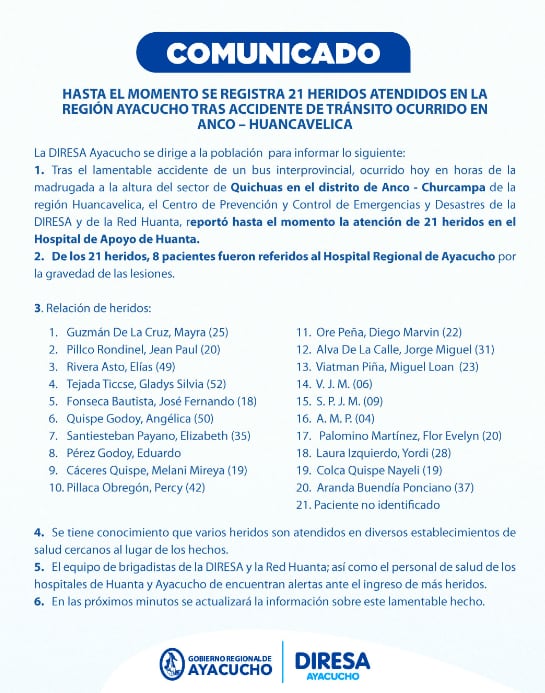 la Dirección Regional de Salud de Ayacucho comunicó que, hasta el momento, 21 heridos han sido atendidos en esta región. De este número, ocho fueron referidos al Hospital Regional de Ayacucho.