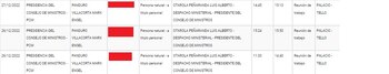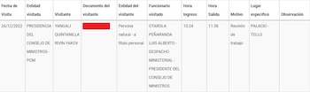 De otro lado, también observamos que Otárola recibió en dos ocasiones a Marx Engel Panduro Villacorta en la sede de la PCM. La primera ocasión sucedió el 26 de diciembre en dos turnos: de 11:33 a 14:40 horas y de 15:24 a 15:40 horas.