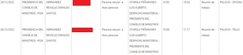 Después está el caso de Oswaldo Hernández Revolle. Según el registro de visitas de la PCM se observa que se juntó con el premier Otárola el 26 de diciembre del 2022 entre las 10:08 y 11:17 horas de la mañana. Previamente, ya lo había visto siete días antes en el Ministerio de Defensa entre las 15:47 a 16:26 horas de la tarde.