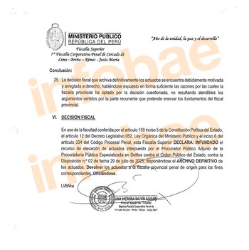 Según lo dispuesto por la Fiscal Superior Titular, Lina Victoria Balvín, quien estaba encargada de estas investigaciones, se concluye “no atendibles los argumentos vertidos por la parte recurrente que pretende enervar los fundamentos del fiscal provincial”. En ese sentido, se declararon infundados “los recursos de elevación de actuados” y los recursos planteados por la Procuraduría que buscaban que se retrocediera en la investigación contra Aguirre.