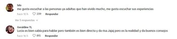 “Me gusta escuchar a las personas ya adultas que han vivido mucho, me gusta escuchar sus experiencias”, “Lucía es bien sabia para hablar, pero también es bien directa y da risa. Pero es la realidad y da buenos consejos”, “Yo de mi cervecita no paso”, “Cuando esté abuelo contándole mis anécdotas a mis nietos jajaja”, “Me encanta esta mujer”, “Debe ser chévere conversar con Lucía, un lujo que te cuente sus anécdotas y sus vivencias”, “Lo cuenta con una pasión, así como canta”, “Te amo, tía, Que viva el Perú”, fueron algunos de los comentarios de los usuarios.
