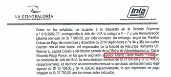 Además, se enfatiza que el INIA no contaba con un presupuesto para que apruebe el pago del monto de remuneración mensual del jefe del INIA de S/ 17 500 o S/ 22 500 durante el 2014. Cabe precisar que Maurer no fue el único que percibió salarios de manera irregular. También se anota que Roberto Santos Gueudut percibió S/ 28 800 sin que le debía corresponder.