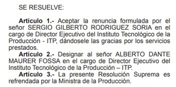 Ayer apareció en el diario oficial El Peruano que la ministra de Producción, Ana María Choquehuanca, nombró a Alberto Maurer Fossa como director ejecutivo del Instituto Tecnológico de la Producción. Según su hoja de vida se destaca que es ingeniero agrónomo de la Universidad Nacional Agraria La Molina y Ph. D. en genética por la Universidad de Missouri (Estados Unidos).