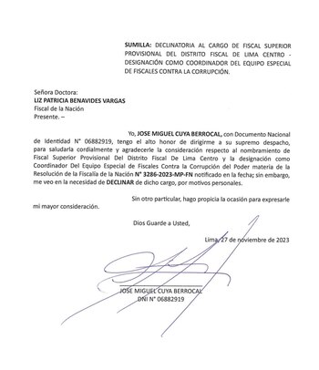 “Tengo el alto honor de dirigirme a su supremo despacho, [...] para agradecerle su consideración respecto al nombramiento de fiscal superior de Lima Centro y la designación como coordinador del Eficcop; [...] sin embargo, me veo en la necesidad de declinar a dicho cargo por motivos personales”, se lee en su oficio.