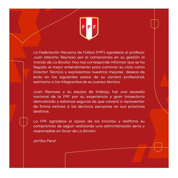 Tras una larga negociación, finalmente la Federación Peruana de Fútbol (FPF) anunció la salida de Juan Reynoso de la dirección técnica de la selección peruana. El ‘Cabezón’ deja el banquillo ‘blanquirrojo’ tras un discreto arranque en las Eliminatorias Sudamericanas, el cual complicó las chances de clasificar al Mundial 2026.