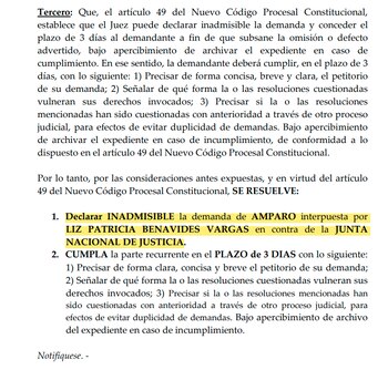 El Tercer Juzgado Constitucional de Lima, a cargo del magistrado John Paredes Salas, declaró inadmisible la acción de amparo de Benavides que apuntaba a dejar sin efecto la suspensión de la JNJ.
