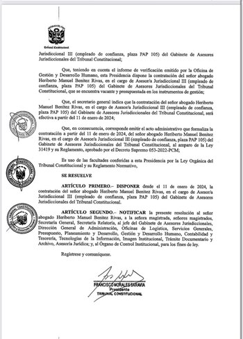 El Tribunal Constitucional (TC) designó este jueves al excongresita Heriberto Benítez, acusado por asociación ilícita y encubrimiento real por el caso La Centralita, como asesor jurisdiccional (empleado de confianza) de su Gabinete de Asesores, según una resolución firmada por el magistrado Francisco Morales, presidente del máximo intérprete de la Carta Magna.