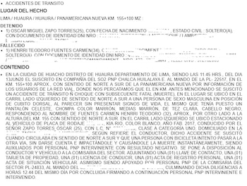 En el parte elaborado por la Policía Nacional del Perú (PNP) se lee que Zapo fue intervenido porque cuando se trasladaba en su auto, en el sentido de norte a sur en la nueva Panamericana, provocó un accidente de tránsito que le costó la vida a Fuentes, quien circulaba con su bicicleta.