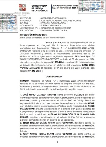 El Poder Judicial dispuso que la defensa legal del encarcelado expresidente Pedro Castillo tenga un plazo de 10 días hábiles para que realice las observaciones a la acusación presentada por la Fiscalía de la Nación respecto a su fallido autogolpe de Estado del 7 de diciembre del 2022, por el que se solicita 34 años de prisión efectiva por cometer los presuntos delitos de rebelión, abuso de autoridad y perturbación al orden público.