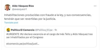 Después de que se hiciera pública la resolución de su vacancia, Vásquez se pronunció en la plataforma de X, antes Twitter: “[Las] inhabilitaciones producidas con fraude a la ley, y sus consecuencias, tendrán que ser revertidas por la justicia”, apuntó el magistrado, quien anunció en una entrevista con La República que recurrirá “al Poder Judicial o el ámbito supranacional”.