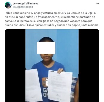 Un niño cuyo padre permanece postrado en cama ha invocado a la directora de su colegio que no le niegue su derecho a la educación, según un clip difundido este jueves por el periodista de Panamericana Televisión, Luis Ángel Villanueva. De acuerdo con la denuncia pública, la directora de la institución ―que pertenece a la Unidad de Gestión Educativa Local (Ugel) N.º 06 de Ate― le impide matricularse, pese su situación familiar.