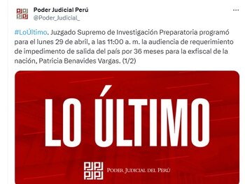 El Poder Judicial fijó para este lunes 29 de abril, a las 11:00 horas, una audiencia para evaluar el pedido de impedimento de salida del país por un plazo de 36 meses contra la suspendida fiscal de la Nación, Patricia Benavides, acusada de liderar una presunta red criminal dedicada al tráfico de influencias en la cúpula de esta institución.
