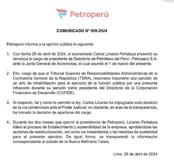Linares Peñaloza había tomado posesión como presidente del Directorio de Petroperú el 1 de marzo. Tras la sanción, la corporación señaló que el economista había apelado el fallo ante el Poder Judicial. Pese a ello, y buscando mantener la transparencia dentro de la gestión de la empresa, decidió renunciar a su puesto.