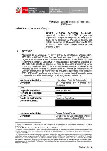 El procurador general de la Nación, Javier Pacheco, solicitó este lunes al Ministerio Público abrir una investigación preliminar contra el expremier Alberto Otárola y el jefe de la Dirección Nacional de Inteligencia (DINI), Roger Arista, debido al espionaje denunciado por el contralor Nelson Shack el año pasado.