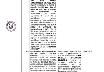 “Yo no estaba en la reunión, ingreso a despacho y ahí es que veo que estaba entregándole un reloj en la mano; ingreso por la puerta, y cuando ingreso veo que él tenía el reloj en la mano, que terminaba de quitárselo. Yo estaba esperando la venia de la presidenta, siguen conversando, pero no llegué a ver que efectivamente se lo hubiera entregado, solo que él hacía el ademán de entregárselo”, anotó.