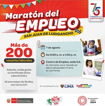 El MTPE también comunicó a la ciudadanía sobre una nueva Maratón del Empleo con la que pondrá a disposición del público más de 200 vacantes. El evento se realizará este miércoles 7 de agosto en San Juan de Lurigancho. Se deberá acudir de 9 de la mañana a 1 de la tarde al Centro de Empleo de ese distrito., ubicado en la avenida Germanio con jirón Vanadio s/n (altura del paradero 17 de Las Flores).