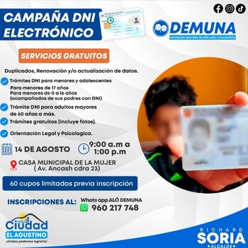 “Este 20 de agosto desde las 9:00 pm en las instalaciones de nuestro Palacio Municipal se realizará una nueva campaña de entrega de DNI electrónico gratuito dirigida a menores de edad entre 0 a 16 años y adultos mayores de 60 años a más por lo que hacemos extensiva la invitación a todos los padres de familia y/o apoderados para gestionar dicho trámite”, publicó la comuna.