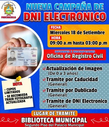 La Municipalidad Distrital de Pichari en la provincia de La Convención en el departamento del Cuzco anunció que organizará campaña de DNI electrónico desde este 18 hasta el 22 de septiembre en distintas localidades.