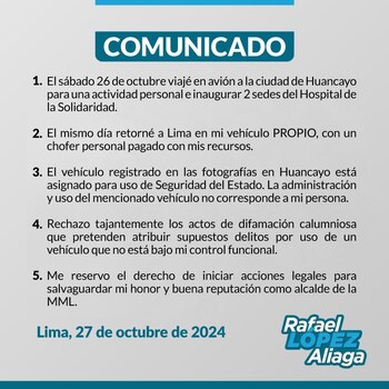 López Aliaga aprovechó el último día de sus vacaciones, que no fueron aprobadas por el Concejo Municipal, para visitar Huancayo y asistir a la presentación de candidatos de su partido, Renovación Popular, en el salón de recepciones Golden Room. Desde su cuenta de X (anteriormente Twitter), el burgomaestre compartió un comunicado en el que aclaró que el 26 de octubre viajó en avión a Huancayo “para una actividad personal e inaugurar dos sedes del Hospital de la Solidaridad”.