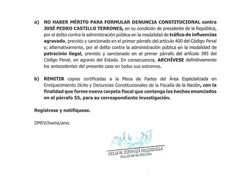 La fiscal de la Nación Delia Espinoza dispuso archivar definitivamente la denuncia constitucional contra el expresidente Pedro Castillo, por el presunto delito contra la administración pública en la modalidad de tráfico de influencias agravado y el patrocinio ilegal, por el presunto uso irregular de helicópteros de las Fuerzas Armadas.