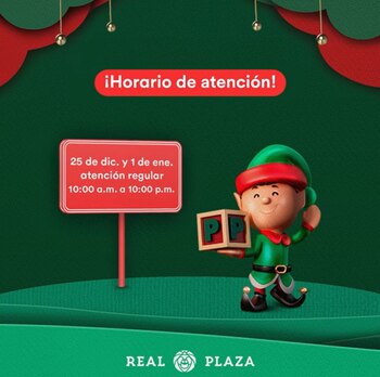 En la temporada navideña, Real Plaza amplía su horario hasta las 11:00 p.m. en fechas clave, ofreciendo promociones especiales, actividades para niños y espectáculos en vivo en algunas de sus sedes. Pero este 25 de diciembre su horario será hasta las 10:00 p.m.