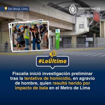 Un adolescente resultó gravemente herido tras ser atacado a balazos en la estación La Cultura de la Línea 1 del Metro de Lima, en San Borja. Por este hecho, el Ministerio Público abrió una investigación preliminar para esclarecer el ataque.