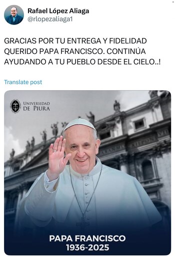 Posteriormente, en su cuenta de X (antes Twitter), escribió: “Gracias por tu entrega y fidelidad, querido papa Francisco. ¡Continúa ayudando a tu pueblo desde el cielo!”.
