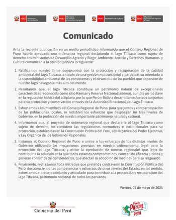 El gobierno de Dina Boluarte mostró su desacuerdo con la ordenanza aprobada por el Consejo Regional de Puno, que reconoce al lago Titicaca como sujeto de derecho. A través de un comunicado, los ministerios del Ambiente, de Desarrollo Agrario y Riego, de Justicia y Derechos Humanos, y de Cultura expresaron que esta norma contraviene la Constitución Política del Perú, carece de eficacia jurídica y genera un conflicto de competencias entre los distintos niveles de gobierno.