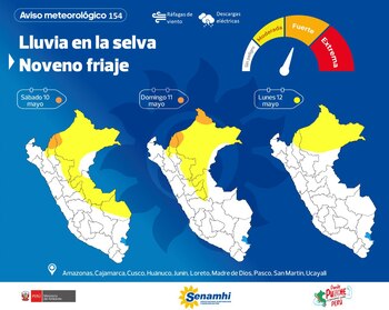 A través de sus canales oficiales, el Servicio Nacional de Meteorología e Hidrografía del Perú (Senamhi) emitió un aviso sobre la ocurrencia de lluvias intensas asociadas al noveno friaje del año en la selva del país. Este fenómeno meteorológico comenzará el sábado 10 de mayo a las 00:00 horas y finalizará el lunes 12 de mayo a las 23:59 horas, con una duración de 71 horas.