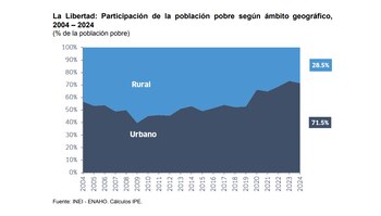 Tras la pandemia, la pobreza en el Perú se ha concentrado en las zonas urbanas y La Libertad no ha sido la excepción. En esta región, la proporción de la población pobre que vive en zonas urbanas pasó de 53.0% en 2019 a 71.5% en 2024, lo que representa un incremento de más de 192 mil personas en situación de pobreza urbana.