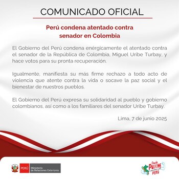 “El Gobierno del Perú condena enérgicamente el atentado contra el senador de la República de Colombia, Miguel Uribe Turbay, y hace votos para su pronta recuperación”, se lee en el pronunciamiento