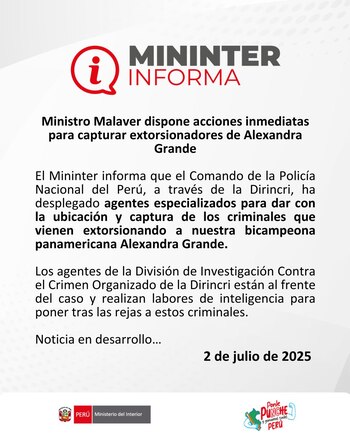 La cartera que dirige Carlos Malaver informó que se ha dispuesto el despliegue de agentes especializados de la Policía Nacional del Perú para dar con la ubicación y captura de los responsables. El caso se encuentra a cargo de la Dirección de Investigación Criminal (Dirincri), unidad encargada de combatir el crimen organizado.