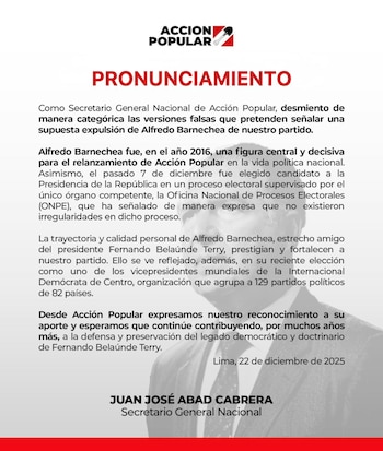 El partido político Acción Popular emitió este lunes un comunicado en el que desmintió “de manera categórica” las versiones sobre una supuesta expulsión de Alfredo Barnechea de sus filas. La organización política calificó como “versiones falsas” los rumores difundidos tras la anulación de sus elecciones internas y ratificó la legitimidad de su proceso electoral realizado el 7 de diciembre de 2025, supervisado por la Oficina Nacional de Procesos Electorales (ONPE).