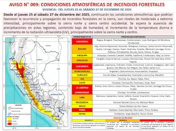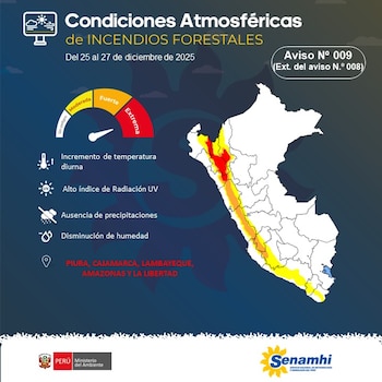 El Servicio Nacional de Meteorología e Hidrología (Senamhi) emitió una advertencia sobre condiciones atmosféricas que podrían favorecer la ocurrencia y propagación de incendios forestales entre el jueves 25 y el sábado 27 de diciembre de 2025. El aviso, vigente durante 71 horas, abarca principalmente la sierra norte y centro del país, donde se prevé un aumento de temperaturas diurnas, bajo contenido de humedad y ausencia de precipitaciones.