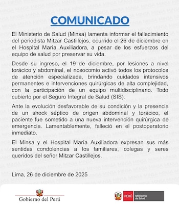 A pesar de los esfuerzos del personal de salud, la evolución de su estado fue desfavorable. El paciente desarrolló un shock séptico de origen abdominal y torácico, lo que obligó a una nueva intervención de emergencia. Mitzar Castillejos falleció en el postoperatorio inmediato, según informó el Minsa, que expresó sus condolencias a la familia, amigos y colegas del comunicador.
