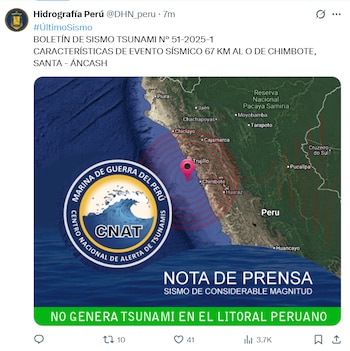 La Dirección de Hidrografía y Navegación precisó que, tras el análisis correspondiente, no existen condiciones para la formación de un tsunami. El monitoreo del litoral se mantiene permanente para garantizar la seguridad de la población costera.
