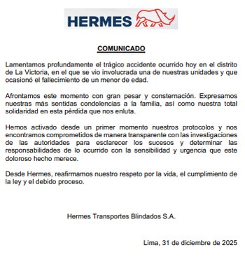 La empresa Hermes se pronunció tras el trágico accidente que involucró a una de sus unidades y ocasionó la muerte de un menor de edad en el distrito de La Victoria. A través de un comunicado, la compañía expresó su profundo pesar por lo sucedido y extendió sus más sentidas condolencias y solidaridad a la familia afectada por esta irreparable pérdida.