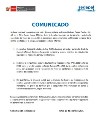 De acuerdo con el pronunciamiento oficial, personal de Sedapal se encargó de trasladar a la señora Teófila Córdova Miranda y a su familia desde la vivienda dañada hacia un hospedaje seguro, mientras se ejecutan las obras necesarias para restablecer las condiciones de habitabilidad. Además, representantes de la aseguradora Baukost-Perú inspeccionaron la zona y la vivienda afectada para evaluar los daños y definir los próximos pasos en la reparación del muro de contención y la reposición de la escalera de acceso público.