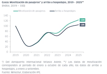 El número de turistas en la región Cusco ya superó su nivel prepandemia. Entre enero y octubre de 2025, el Aeropuerto Internacional Velasco Astete de Cusco movilizó 4,1 millones de pasajeros, una cifra 24% por encima de lo registrado durante el mismo periodo de 2019 (3,3 millones). Asimismo, entre enero y setiembre, se registraron más de 2,8 millones de arribos de turistas a hospedajes en la región, 5% por encima de lo observado en el mismo periodo de 2019.