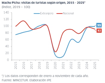 Sin embargo, este avance no se ha reflejado en una mejora similar en el número de visitas a Machu Picchu, donde persisten restricciones operativas y de gestión. Entre enero y noviembre de 2025, el santuario recibió 1,4 millones de visitas, 3% por debajo del nivel registrado en el mismo periodo de 2019 (1,5 millones). Este rezago responde principalmente a la menor llegada de visitantes nacionales (-8%) y a la reducción de visitantes internacionales (-1%). En total, se estima que, en los últimos cinco años, Machu Picchu dejó de recibir más de 5,3 millones de visitas respecto a su tendencia prepandemia. Según cálculos del IPE, ello habría implicado una pérdida acumulada de ingresos por venta de boletos equivalente a S/ 770 millones, ajustando por inflación.