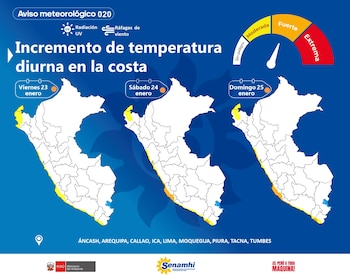 De acuerdo con el Aviso N°020 emitido por el Senamhi, el incremento de la temperatura diurna en la costa peruana se mantendrá hasta el 25 de enero, con una intensidad que oscilará entre moderada y fuerte. En Lima Metropolitana, se esperan registros entre 28℃ y 33℃ para los próximos días, con mayor incidencia en distritos de Lima este y Lima norte, donde los termómetros podrían acercarse a los 32℃. En Lima oeste y centro, las máximas se situarán entre 27℃ y 30℃.