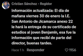 Asimismo, el regidor provincial de Huarochirí, Cristian Sánchez, informó públicamente que el problema tendría una pronta solución. Según precisó, el director de la institución educativa le comunicó que el viernes 30 de enero se realizaría la entrega del certificado de estudios al joven Benjamín, lo que permitiría regularizar su situación ante la universidad.