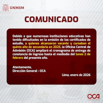 En paralelo, la Universidad Nacional Mayor de San Marcos emitió un comunicado oficial a través de su Oficina Central de Admisión (OCA). En el documento, la casa de estudios reconoció que numerosas instituciones educativas han presentado dificultades en la emisión de certificados de estudios para los alumnos que cursaron el quinto año de secundaria en 2025. Ante ello, anunció la ampliación del cronograma de entrega de la constancia de ingreso hasta el mediodía del lunes 2 de febrero del presente año.