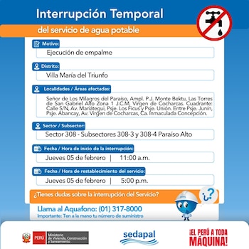 En Villa María del Triunfo, el corte de agua iniciará a las 11:00 y se extenderá hasta las 17:00. Las áreas comprendidas incluyen las habilitaciones del Sector 308 Sub-Sector 308-04 / RAP-4 (R-8 de diciembre), en el siguiente cuadrante: A.H. Señor de los Milagros del Paraíso, A.H. Ampl. P.J. Monte Bektu, A.H. 8 de Diciembre, A.H. Las Torres de San Gabriel Alto zona 1 J.C.M. y A.H. Virgen de Cocharcas. El motivo principal es la ejecución de empalmes en la red.